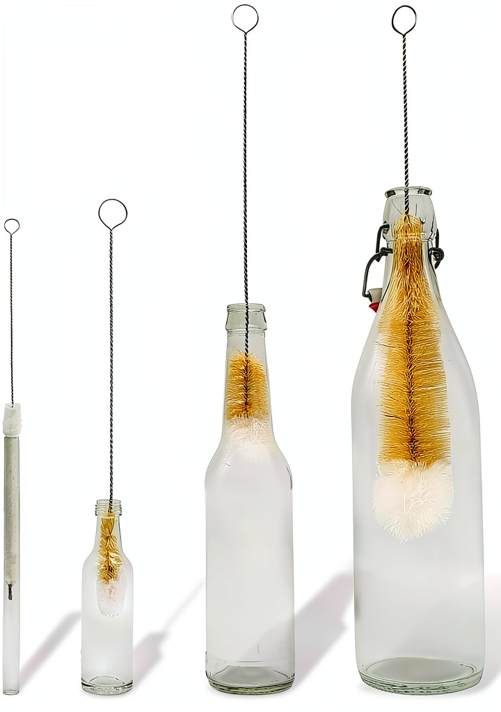 The set includes four bottle cleaning brushes of different sizes, each with a stainless steel handle and soft cotton or sisal bristles, covering a wide range of cleaning needs.